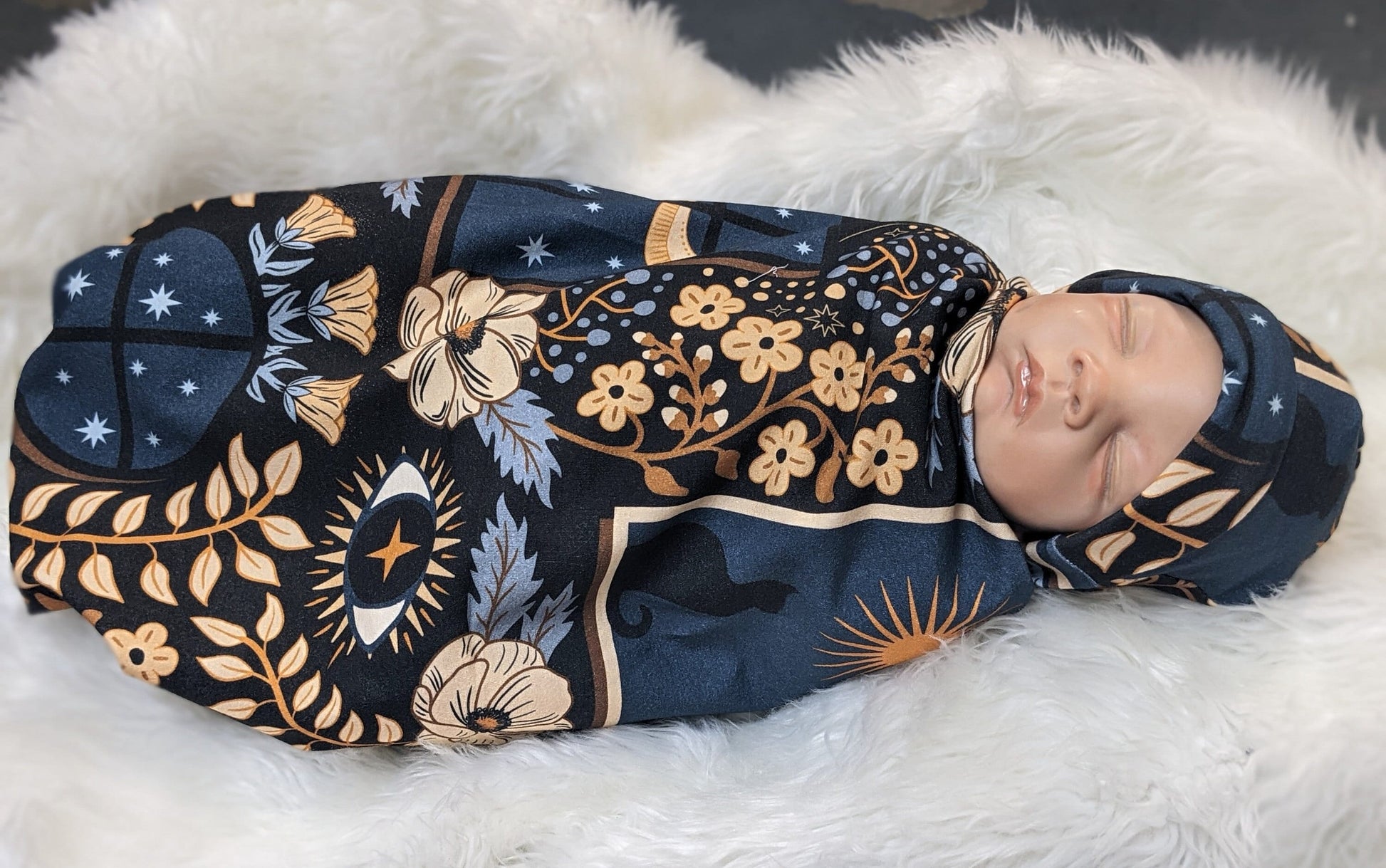 But that's not all - we also welcome custom requests! So if you have a specific design or fabric in mind, don't hesitate to reach out and we'll work together to create a one-of-a-kind piece for your little one. After all, we love playing around with different fabrics and creating unique sets with our customers. Embrace the magic of Whimsigoth and order your Gothic Night swaddle blanket and hat today.